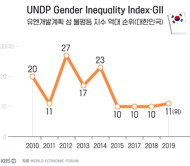 '성 불평등 지수'를 보면 우리나라는 매년 순위가 높게 나타났습니다. 적게는 138개국, 많게는 189개국을 대상으로 조사한 결과 우리나라는 가장 높을 땐 10위, 가장 낮을 때도 27위를 기록했습니다.