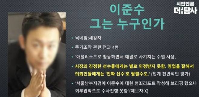 이 모 씨가 누구인지는 여러 언론 보도와 유튜브 더 탐사, 새날 등을 통해 '새강자 이준수'라는 이름이 지목됐고, 이후 디시 등 온라인 커뮤니티에 그의 얼굴 사진이 퍼지기도 했습니다.