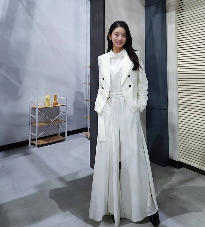 전신 화이트 코디네이션으로 완성한 이가령의 스타일링은 미니멀한 세련미가 돋보인다. 더블 브레스트 롱 코트와 와이드 팬츠의 조합이 모던하면서도 우아한 실루엣을 만들어내고 있으며, 톤온톤 매치로 고급스러운 분위기를 연출하고 있다.