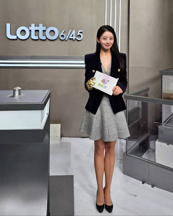 이가령은 로또 6/45 방송 현장에서 네이비 더블 브레스트 재킷과 그레이 플리츠 스커트로 완성한 클래식한 비즈니스 룩을 연출하고 있다. 골드 버튼 디테일이 돋보이는 재킷과 무릎 위 길이의 스커트가 젊은 전문직 여성의 이미지를 완벽하게 표현하고 있으며, 블랙 포인티드 토 펌프스로 세련된 마무리를 보여주고 있다.