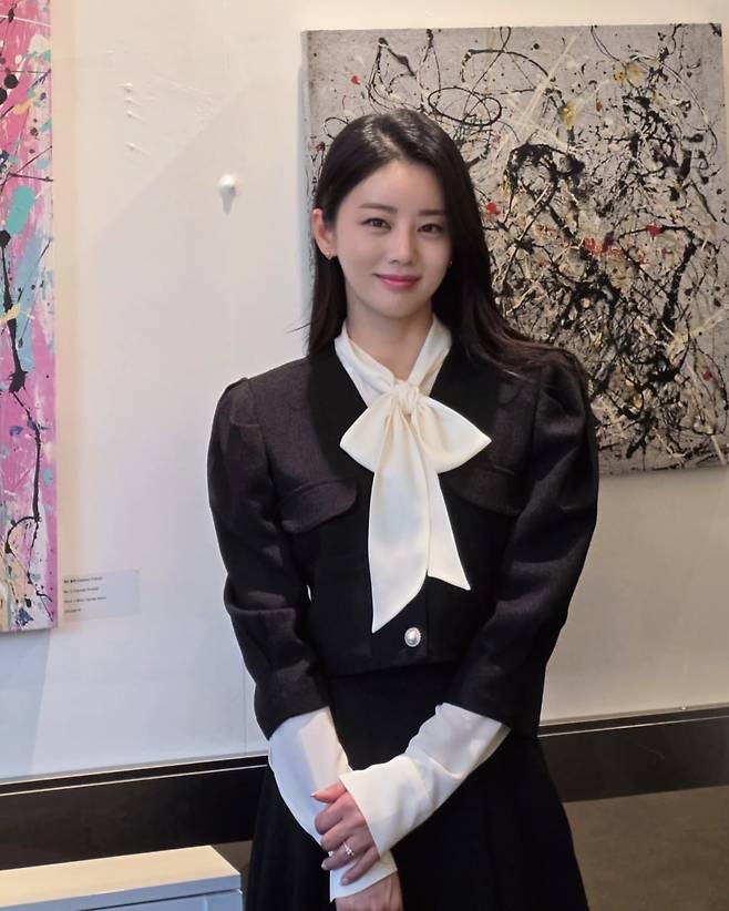 미술관에서 선보인 이가령의 룩은 블랙 재킷에 화이트 보우 타이 블라우스를 매치한 모던 클래식 스타일이다. 진주 버튼과 리본 디테일이 페미닌한 감성을 더하고 있으며, 예술적 공간과 어우러지는 지적이고 세련된 분위기를 연출하고 있다.
