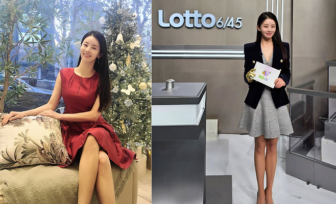 크리스마스 트리 앞에서 포즈를 취한 이가령은 와인 레드 컬러의 민소매 원피스로 계절감 있는 스타일링을 완성했다. 적당한 A라인 실루엣과 무릎 길이의 단정한 기장감이 우아함을 더하고 있으며, 다크 컬러 펌프스와의 조화로 세련된 홀리데이 룩을 연출하고 있다.