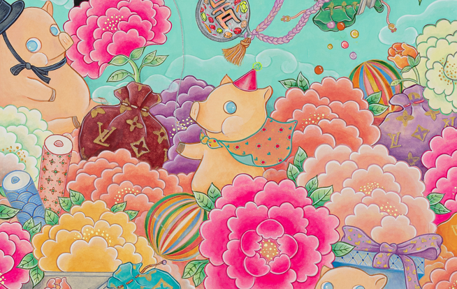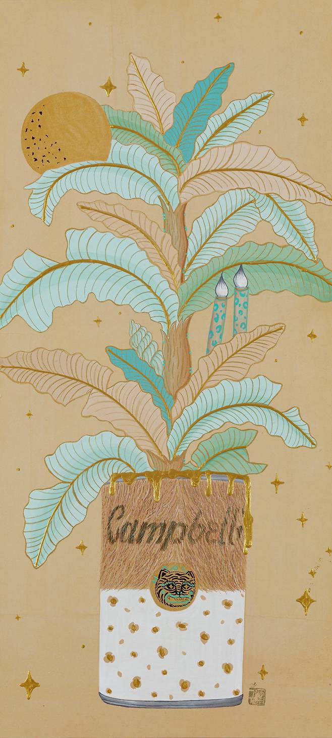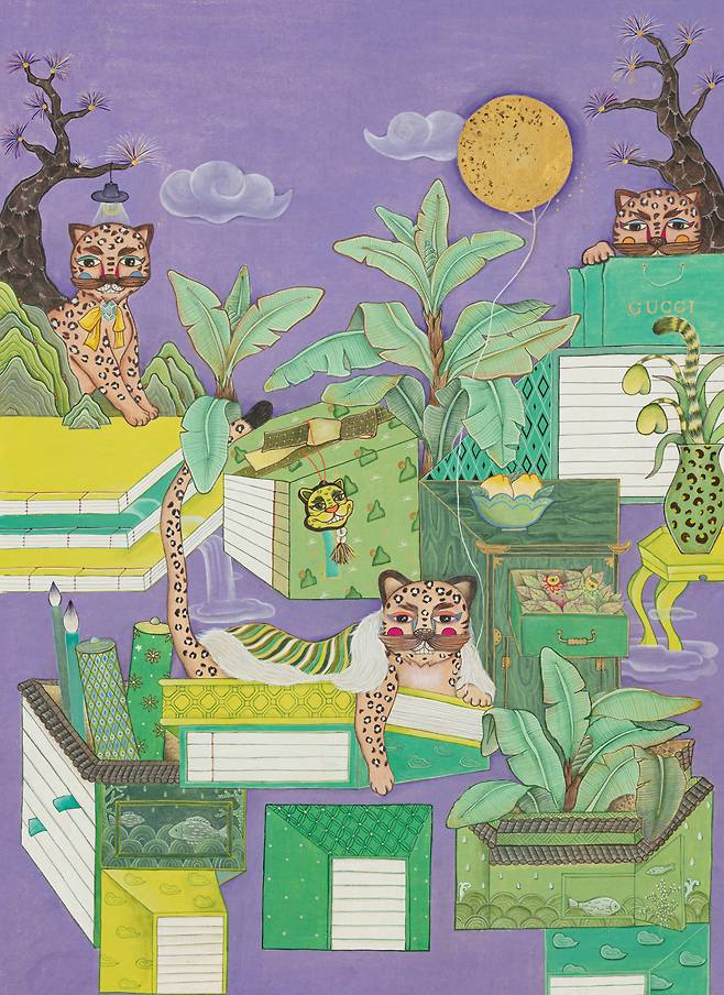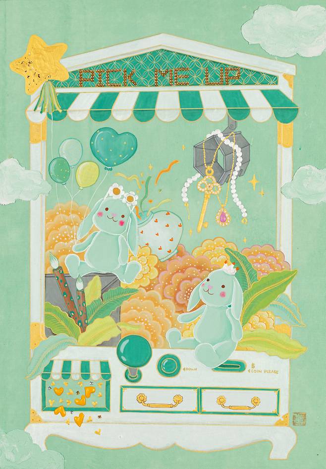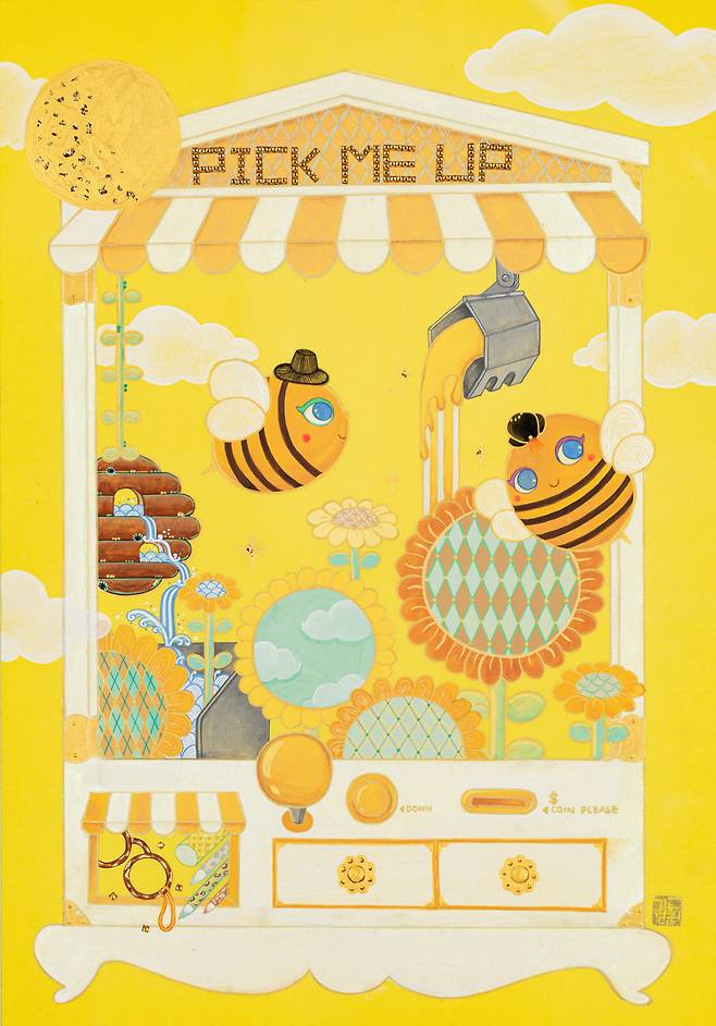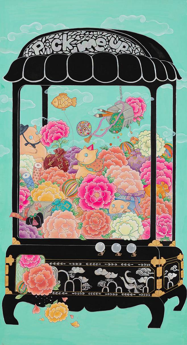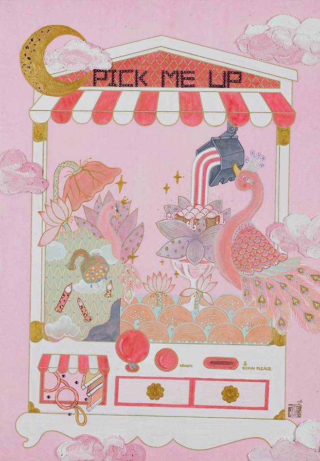 현대인의 휴식을 고민하면서 그린 달항아리와 일월오봉도(日月五峯圖)의 만남, 책가도와 뒤섞인 모란의 풍요는 '길상 미학의 정점'을 한 화면에 모은다는 점에서 '복에 복을 더한 작가만의 개성화'의 방식이다. 'pick me up'이라는 글자가 인형 뽑는 자판기(오리/돼지/꿀벌 버전 등)와 결합된 작품에서는 '행복뽑기'라는 감성자판기가 우리 삶을 휴식과 위로로 이끈다. 궁중채색화에서 본뜬 호피문양의 민화는 책가도와 결합해 '한국민화'의 세계화를 MZ세대만의 유쾌함으로 그려낸다.
