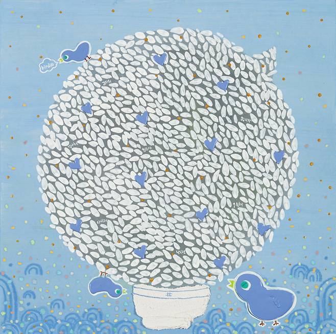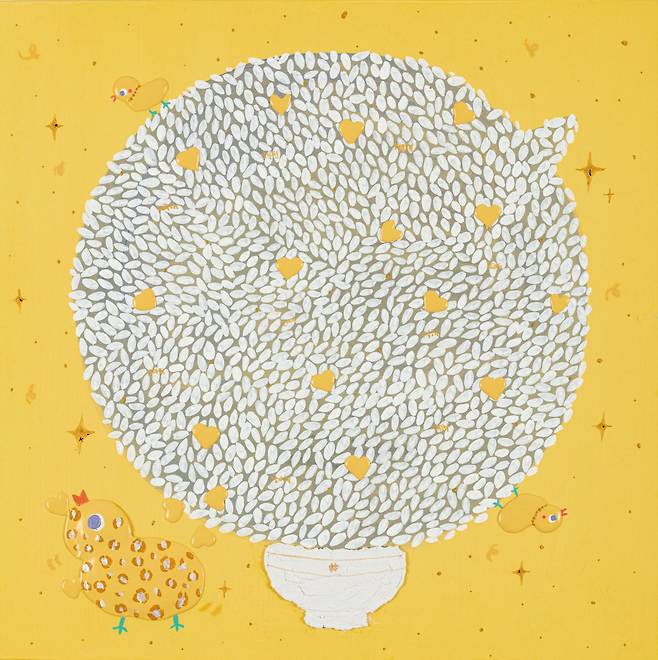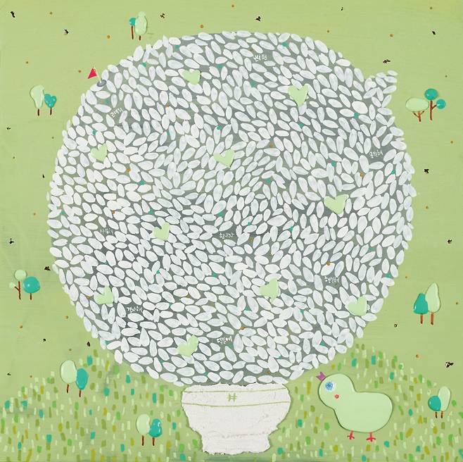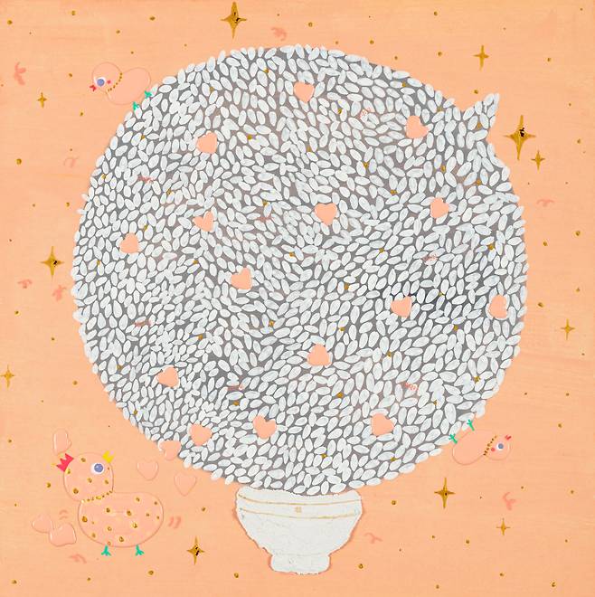 앞서 설명한 작품들이 ‘창작민화’의 팝적 형상화라면, 작은 밥그릇에 몇 배 크기의 고봉밥을 한가득 담은 '#밥'시리즈는 자신만의 세계관을 담은 독특한 미감을 보여준다. 작가는 '밥'앞에 '해시태그'를 담은 이유에 대해 “밥이 일종의 말풍선이 되어 서로 간의 소중한 마음을 전하는 매개체로 기능하기를 바란다.”고 말했다. 밥알 하나하나에 담긴 사연들, 무엇보다 콩처럼 박혀있는 형상부조들은 평범한 삶 속에서도 새로움을 좇는 작가의 실험성으로 해석할 수 있다.