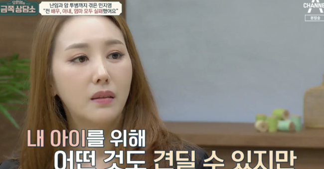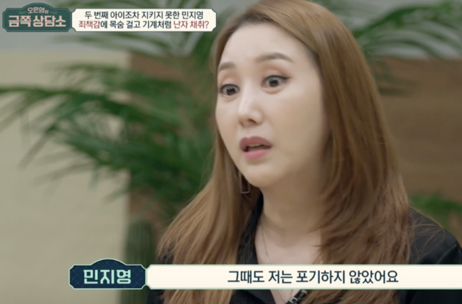 두번째 유산한 민지영의 마음은 어땠는지 물었다. 민지영은 “아이를 갖기 위해 건강검진했을 대 갑상샘암 판정을 받아그래도 포기히자 않아, 이만하면 다행이다 생각했다”며 “수술을 3개월 미뤄두고 몰아서 난자채취를 기계처럼 했다”고 했다. 암수술까지 연기하며 난자채취를 했다는 것.