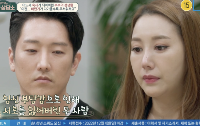 오은영은 두 사람에게 성적인 불만도 있다고 했다. 민지영은 ‘남편과 성관계는 생각하고 싶지 않다’고 대답, 김형균도 ‘성 생활 의미가 없이 멈춰있다, 아내가 아이에 대한 부담을 버리고 싶다’고 적었다. 그러면서김형균은 “(부부관계가) 사랑표현 방식이었다면 어느 순간 임신만을 위한 것이 되더라, 의무감에 스트레스가 되고 실망하게 되고 싸우니 피하게 된다”고 말했다. 민지영은난임센터에서 숙제처럼 부부관계를 반복하게 됐다며 “어느 순간 배란일이 무서워지게 되더라, 사랑해서 결혼했는데 이게 맞는건가 싶더라”면서 “여자 민지영과 남자 김형균이 점점 사라진 느낌”이라며 고민을 전했다.