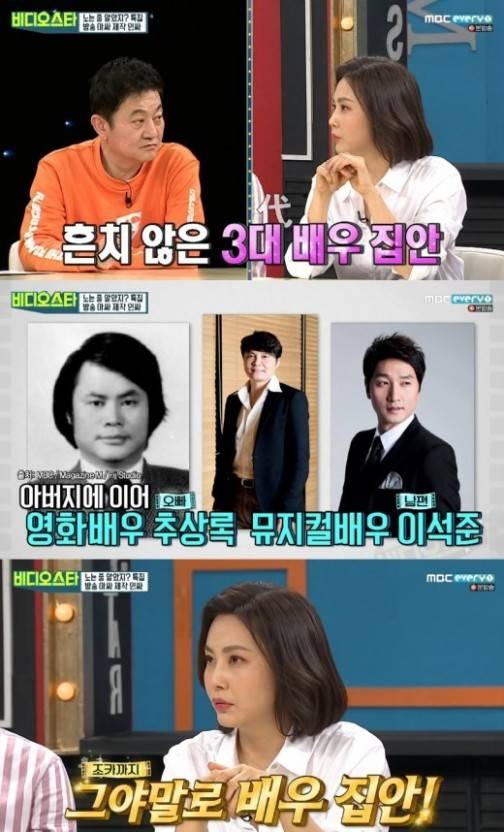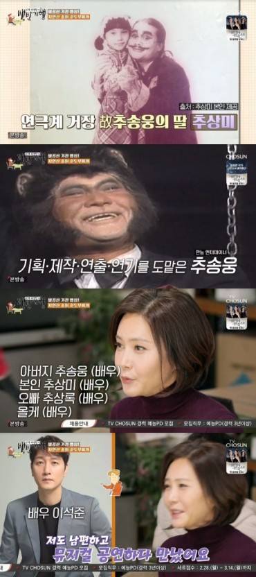 배우 추상미는 유명 배우였던 아버지는 배우 고 추송웅, 어머니 역시 국립극단 출신의 배우, 작은 오빠는 배우 추상록이며, 와이프(올케)도 배우 출신, 남편은 뮤지컬 배우 이석준으로 연예계 대표 배우 집안으로 꼽힙니다. 조카 또한 배우를 준비 중으로 알려져 3대 배우 집안을 완성했습니다.