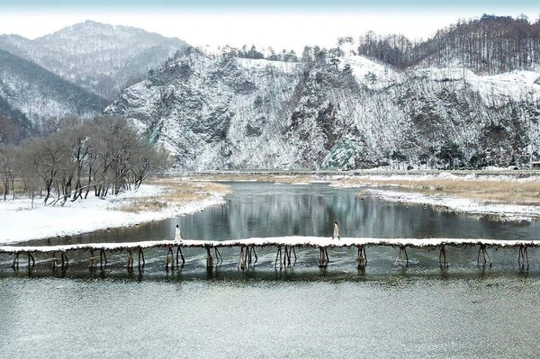 영월군 주천면 평창강 위에 놓인 섶다리는 잔가지와 솔가지, 흙으로 만들어지는 독특한 다리예요. 농번기가 끝난 뒤 임시로 다리를 놓았다가 다음 해 장마철이면 자연스럽게 떠내려가도록 한 전통 방식에서 유래되었지요. 굵은 나무 기둥에 엮어 만든 이곳은 흰 눈과 강물의 푸른빛이 어우러지는 겨울에 특히 장관이에요. 잠시 걸어보면 마치 시간여행을 하는 듯 포근한 정취를 느낄 수 있어요. 주소는 강원도 영월군 주천면 송학주천로 2141 근방에 있어요.