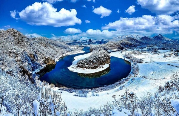 삼면이 물로 둘러싸인 지형이 우리나라 한반도를 꼭 빼닮았다 하여 이름 붙은 곳이에요. 영월의 대표 비경 중 하나로 꼽히며, 주변 산책로를 따라가다 전망대에 오르면 마치 지도를 펼쳐 본 듯 휘감아 도는 강물과 나지막한 산자락이 감탄을 자아내지요. 처음 발견되었을 당시 지역 주민이 우연히 오르던 산길에서 내려다본 모습이 한반도와 똑 닮았다고 전해져 더욱 유명해졌어요. 주소는 강원특별자치도 영월군 한반도면 한반도로 555 근처예요.