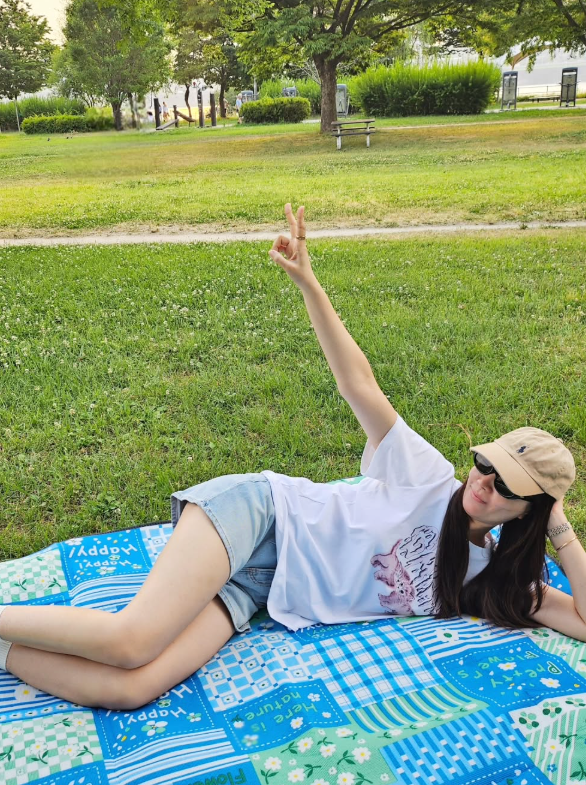 김유미는 푸른 잔디 위에 깔린 블루 계열 피크닉 매트에 누워 여유로운 포즈를 취하며, 무심한 듯 감각적인 여름 패션을 선보였다.