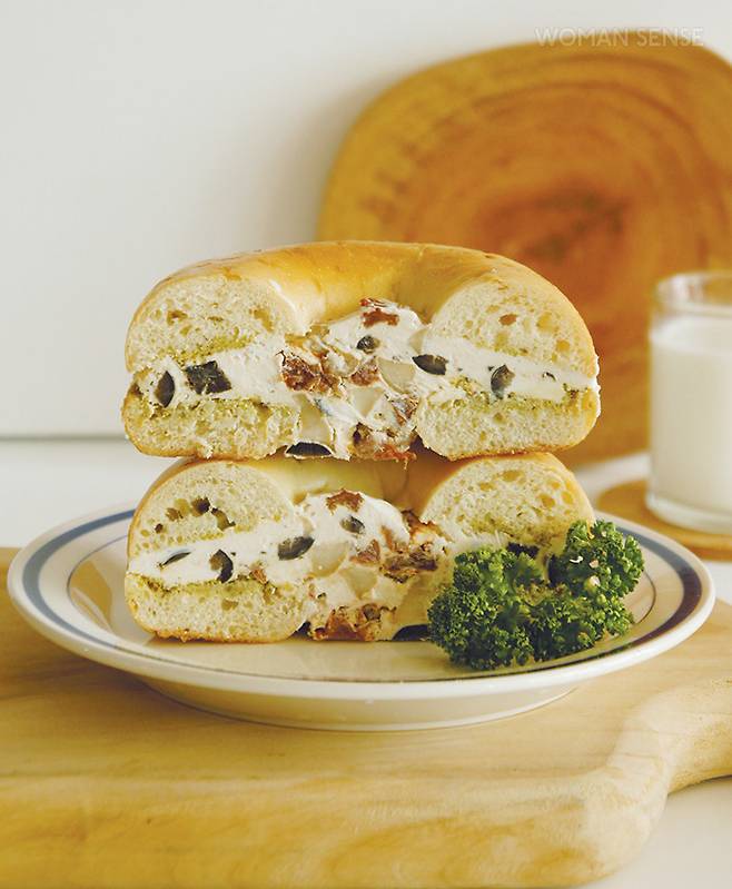 6 베이글에 ④를 올린 후 남은 베이글로 덮는다.