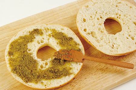 5 베이글 한쪽 면에 바질 페스토를 펴 바른다.