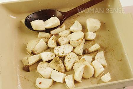 3 팬에 올리브유를 두르고 미니 새송이버섯을 넣어 센 불에서 볶는다. 소금, 후춧가루, 파슬리 가루를 넣고 버섯이 살짝 노릇해질 때까지 볶아 그릇에 덜어 한 김 식힌다.