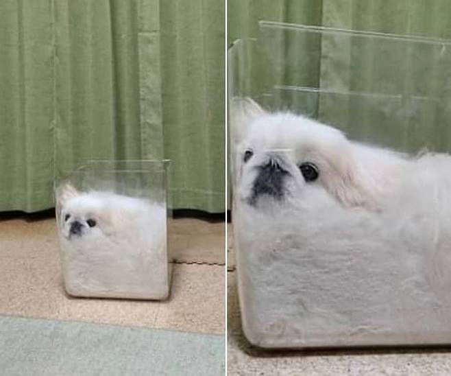 공개된 사진 속에는 피키니즈 견종 강아지가 투명 아크릴 박스에 들어가서는 자신을 찍는 집사를 뚫어져라 빤히 바라보고 있었죠.