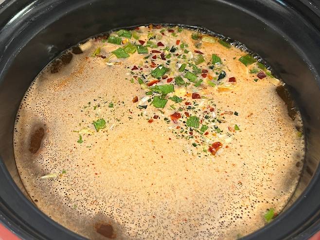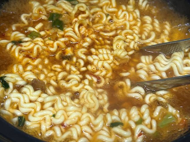 스프를 먼저 넣고 끓여주면 면이 덜 부풀기 때문에 상대적으로 쫄깃한 식감을 느낄 수 있습니다.