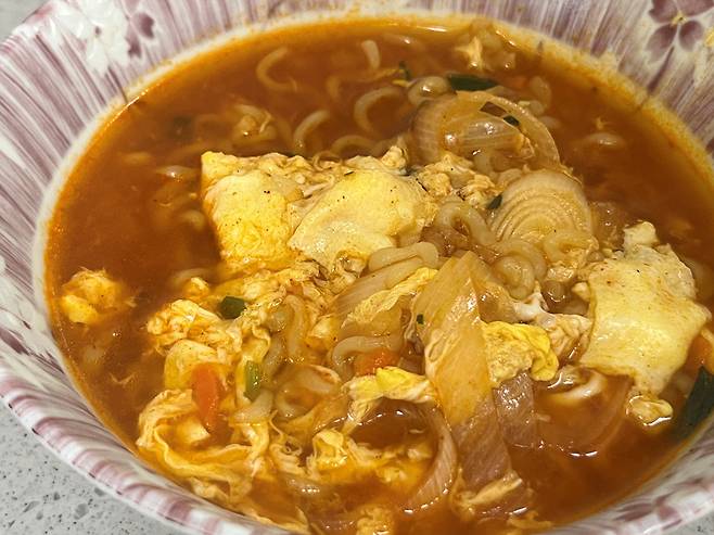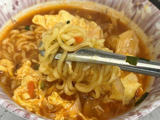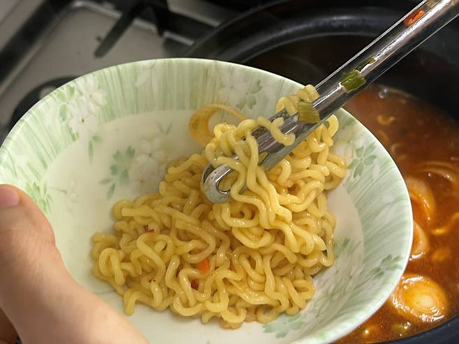 면을 먼저 덜어 놓고 그다음 국물을 부으면 면발이 퍼지는 것을 막고 쫄깃한 식감을 오래 유지할 수 있습니다.