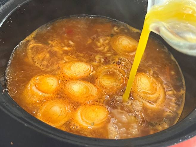 국물은 따로 1분 정도 더 끓입니다. 계란을 넣을 경우 이때 계란을 천천히 부어서 익혀 주세요.