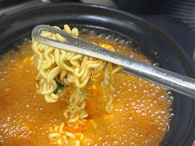 평소에는 라면이 다 익고 난 다음 면과 국물을 같이 덜어서 먹었는데요. 이제는 무조건 면이 80% 익었을 때 먼저 건져내세요!