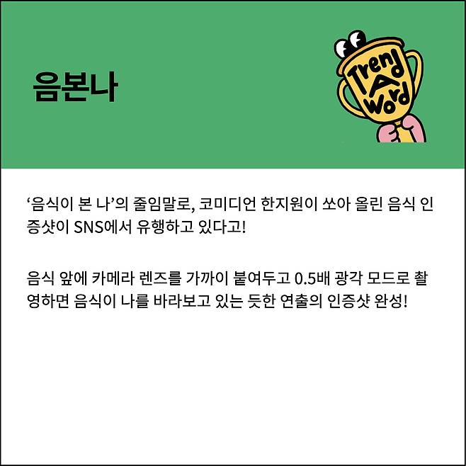 와중에 신박하면서 귀여운 음식 인증샷까지 요즘 유행한다고 하니, 더욱 맛있는 음식점을 찾아다니고 싶다! 그렇다, 오늘의 트렌드 어 워드는 바로 ‘음본나’! 빠르게 한 번 살펴보자.