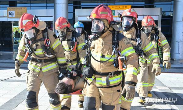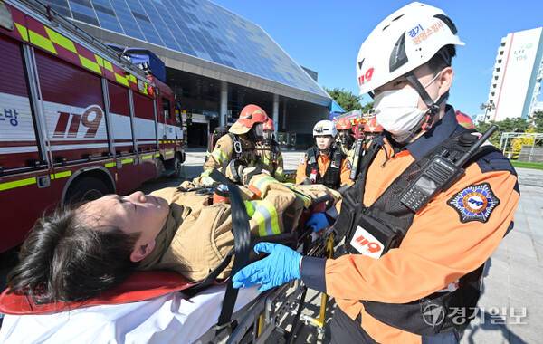 27일 오후 광명시민체육관에서 열린 '2025년 재난대응 안전한국훈련'에서 소방관계자가 부상당한 소방관을 들것을 이용해 이동시키고 있다.