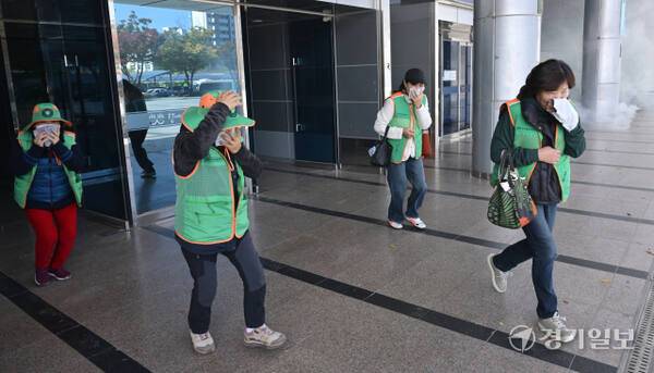 27일 오후 광명시민체육관에서 열린 '2025년 재난대응 안전한국훈련'에서 다중밀집지역에서 화재가 발생하자 시민들이 대피하는 훈련을 진행하고 있다.