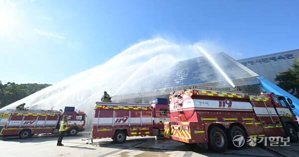 27일 오후 광명시민체육관에서 열린 '2025년 재난대응 안전한국훈련'에서 소방관계자들이 소방차 등을 이용해 종합방수를 진행하고 있다. 광명시, 광명소방서, 광명경찰서 등 8개 기관이 참여한 이번 훈련은 다중밀집시설 대형화재를 가장해 대피, 인명구조, 복구활동 등의 훈련을 진행했다.