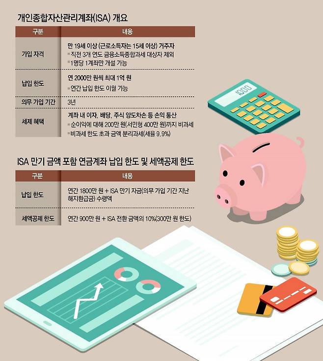 ISA가 국내에 처음 도입된 것은 2016년 3월 무렵이다. 당시 ISA는 만능통장이라 불리며 세간의 인기를 끌었다. 한 계좌에서 예금, 적금, 펀드, 주가연계증권(ELS) 등 다양한 금융상품에 투자할 수 있는 데다 비과세와 분리과세 등 절세 혜택까지 주어졌기 때문이다. ISA 계좌에서 발생한 이자와 배당소득에는 최대 200만 원(서민형 400만 원)까지 비과세 혜택이 주어지고, 비과세 한도를 초과한 이자와 배당소득은 9.9%(지방소득세 포함) 세율로 분리과세한다. 정부는 ISA 비과세 한도를 2.5배로 확대하고, 납입 한도도 2배로 늘리는 법 개정을 추진 중이다.