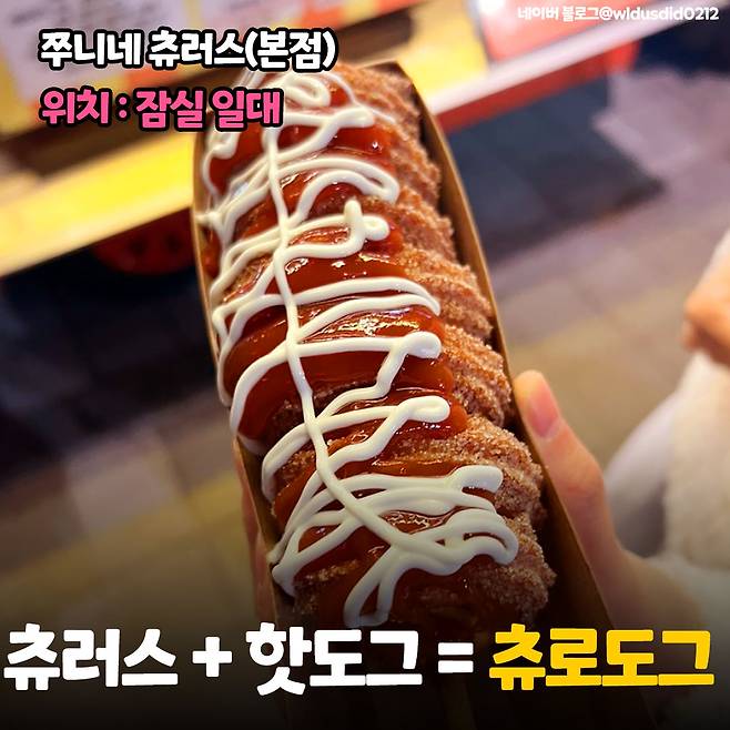츄러스와 핫도그의 조합인데 소시지 겉을 츄러스로 감아 만든 거예요. 츄러스의 달달 바삭함과 소시지의 짭조름하고 부드러움이 환상입니다. 매주 츄로도그를 먹었었는데 덕분에 3kg이 쪘던 기억이 있어요ㅎㅎㅎ