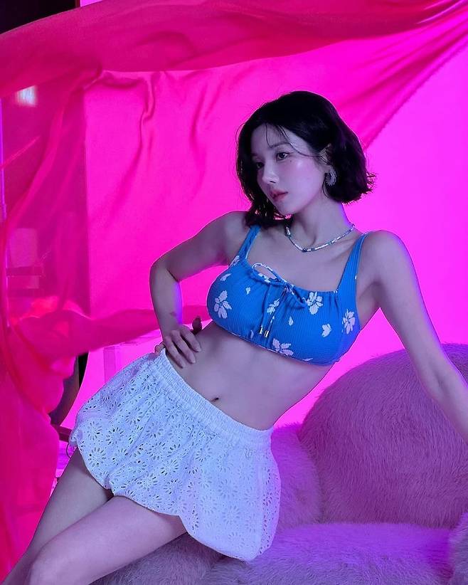 두 번째 스타일은 플라워 패턴이 인상적인 블루 비키니 탑과 펀칭 디테일의 화이트 숏팬츠 조합이다. 형광 핑크빛 조명이 그녀의 피부톤을 한층 화사하게 만들어주는 가운데, 하늘색 탑의 러블리한 무드가 조화를 이루며 페스티벌 분위기를 물씬 풍긴다. 목선을 따라 연출한 비즈 네크리스는 Y2K 감성을 자극하며, 룩 전체의 톤을 경쾌하게 이끌어낸다.