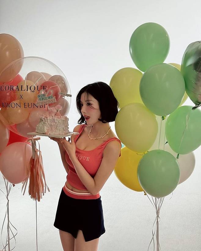 마지막 착장은 코랄리크와의 협업을 기념하는 컬래버레이션 룩이다. ‘CORALIQUE’ 로고가 박힌 레드 크롭탑에 블랙 미니 랩스커트를 매치해 활동성을 더했다. 이 룩은 페스티벌뿐만 아니라 썸머 파티, 생일 모임 등에서도 활용도가 높은 스타일로, 아기자기한 풍선과 케이크가 어우러져 권은비 특유의 러블리한 매력을 배가시킨다.