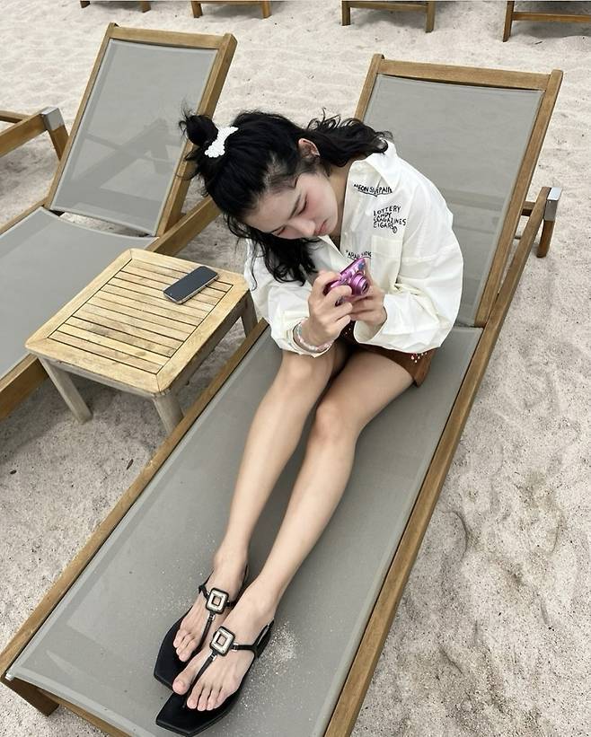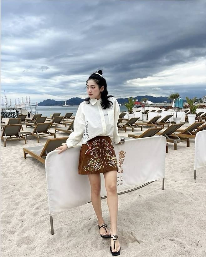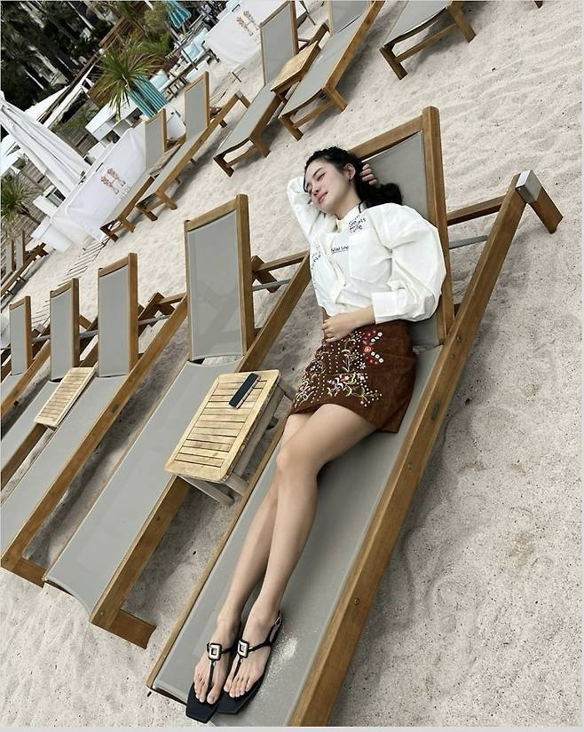 브라운 컬러의 자수 장식 미니스커트에 오버핏 화이트 셔츠를 걸친 감각적인 꾸안꾸룩으로 시선을 모았고, 자연스럽게 반묶음한 웨이브 헤어와 크롭 셔츠 소매의 롤업 스타일링으로 경쾌한 휴양지 무드를 더했습니다.