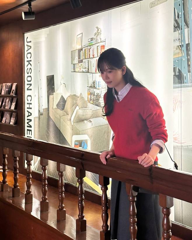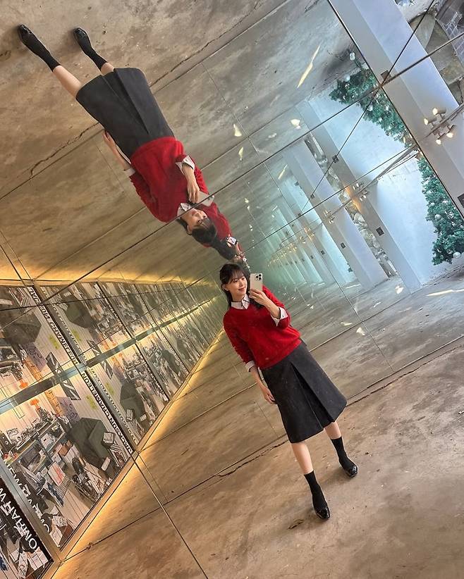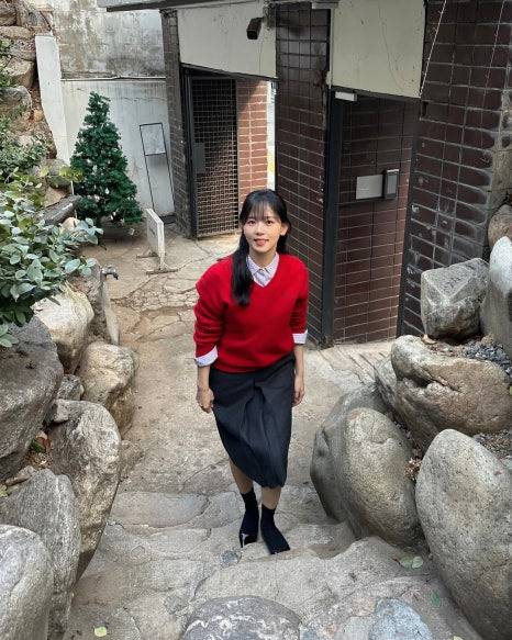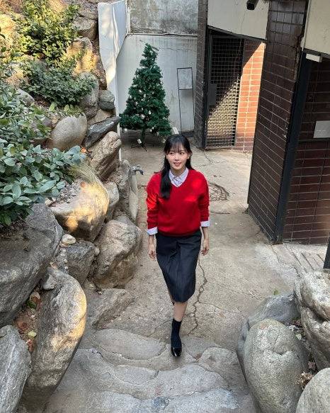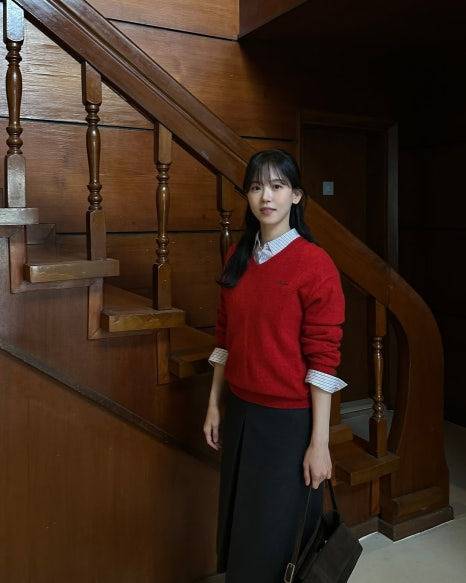 근데 패션까지 완벽하면 반칙 아니냐고! 화사한 레드 브이넥 니트에 스트라이프 셔츠를 레이어드해서 단정한데 세련된 느낌까지 싹 다 잡았어. 아래엔 심플한 블랙 스커트를 매치했는데!