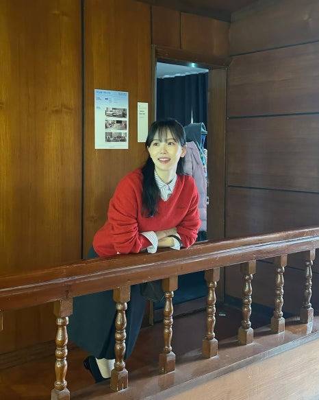 강한나, 진짜 사람 설레게 하는 재주가 있다니까. 난간에 기대서 빼꼼~ 하고 고개를 내민 이 모습, 너무 사랑스럽지 않아? 딱 봄날의 따뜻한 분위기랑 찰떡이야.