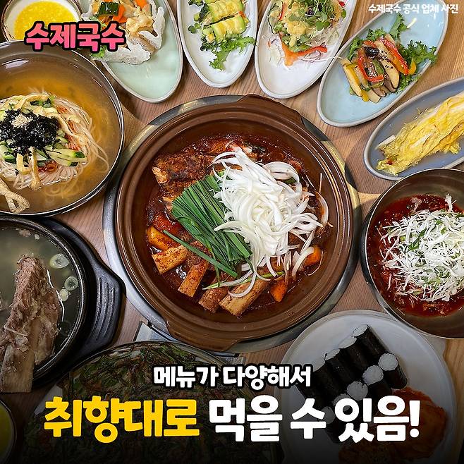 수제국수 말고도 갈비찜, 육회, 삼겹살, 돈까스 등 면류, 고기류, 주전부리, 식사류 다양하니 입맛 따라 취향 따라 골라 먹기 좋을 것 같아요:)