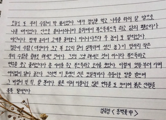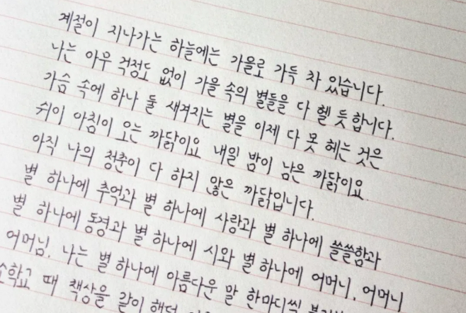 바른 글씨체를 익혔다면 긴 글을 쓰는 연습을 해보세요. 내 마음에 드는 글이라면 어떤 글이어도 좋아요. 긴 글을 쓸 때는 최대한 집중해서 바른 자세로 글을 써주세요. 처음에는 힘들지만 차근차근 쓰다 보면 어느 순간 좋은 습관이 만들어져 있을 거예요.