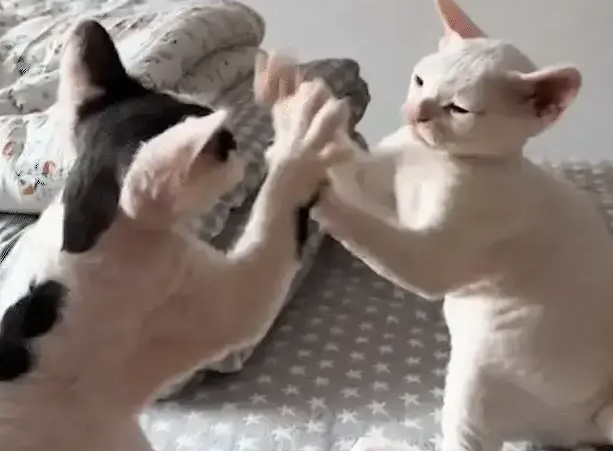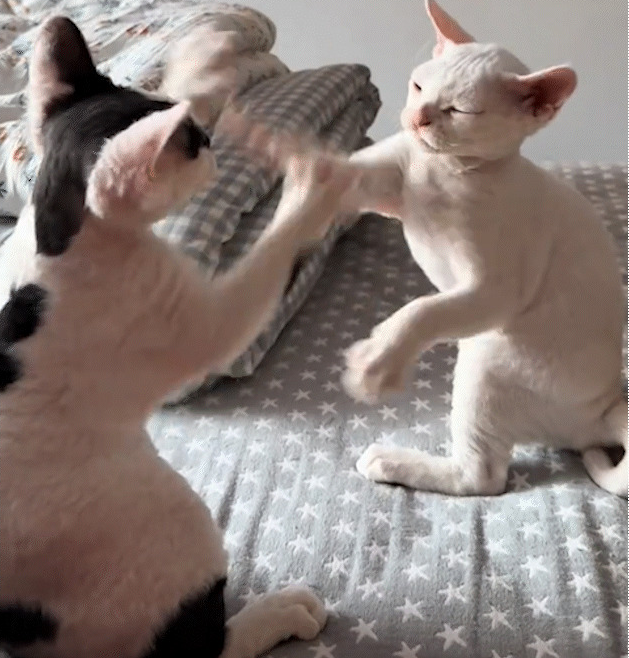 두 고양이가 복슬복슬한 작은 앞발을 내밀어 상대방 앞에서 겨루는 모습은 마치 무술 대결을 준비하는 두 명의 대협 같았습니다. 하지만 이 대협들의 치명적인 결점은 바로 너무나 귀엽다는 점이었습니다!