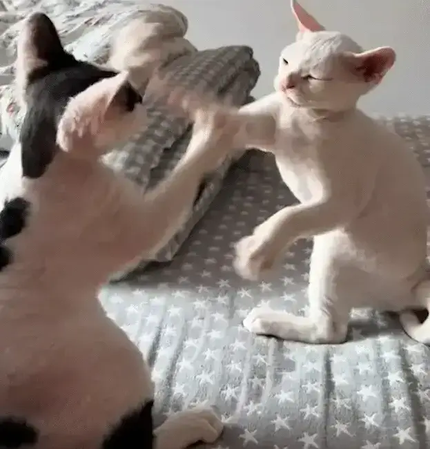 자세히 들여다보니, 이건 격렬한 전투가 아니라 명백히 서로 '손바닥 치기' 놀이였습니다! 작은 발로 부드럽게 살포시 건드리고는 천천히 발을 거두고, 다시 사나운 표정으로 상대를 노려보다가 이어서 '성의 없는' 겨루기를 계속했습니다. 이건 진짜 싸움이 아니라, 코믹한 '고양이 무언극' 공연이었던 것입니다!