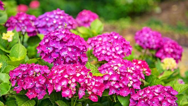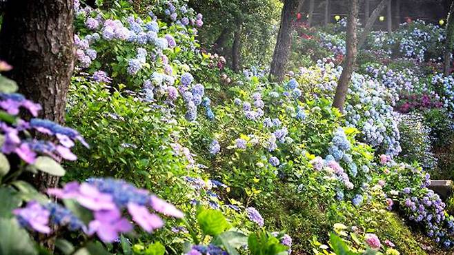언덕을 따라 피어난 수국들이 양옆으로 줄지어 서 있는 이 길은 마치 자연이 만들어낸 꽃 터널 같다.