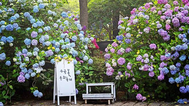 수국은 시간이 지날수록 색이 바뀌기 때문에, 축제 기간 내내 조금씩 다른 매력을 품는다. 어떤 날은 연한 파스텔톤의 꽃들이, 또 어떤 날은 선명한 보랏빛 수국들이 시선을 사로잡는다.