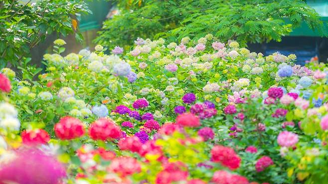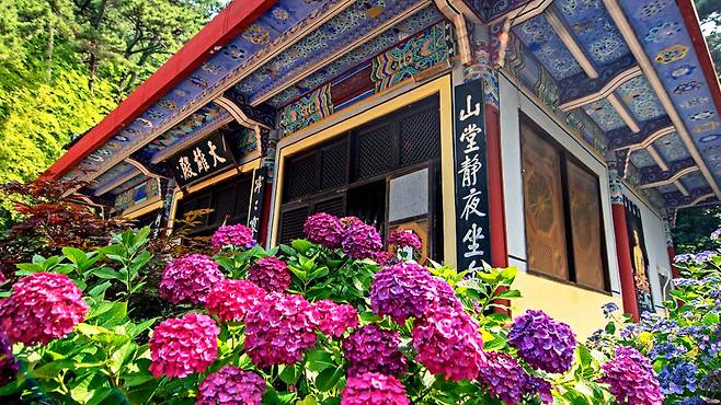 흰색, 분홍, 보라, 파랑까지 그라데이션처럼 퍼지는 수국들 사이에서 사찰의 고즈넉한 분위기는 더욱 깊이 있게 다가온다.
