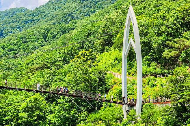 연하협구름다리는 괴산 산막이옛길과 충청도양반길을 연결한 다리로 현수교 형식의 출렁다리입니다. 다리를 건너며 흔들거리는 아찔한 스릴을 느낄 수 있고, 탁 트인 호수 전경을 감상할 수 있습니다.