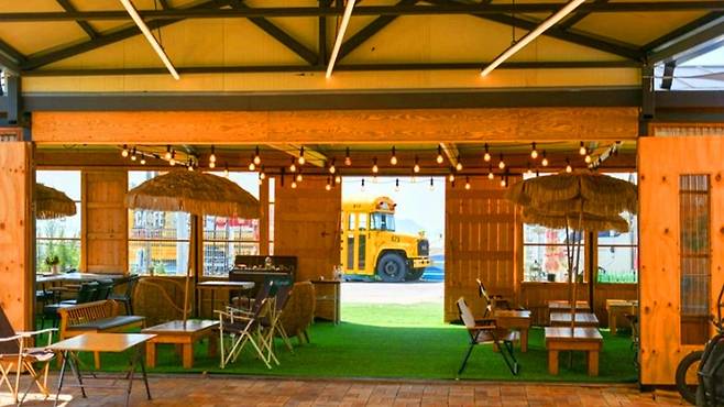 미국에서 들여온 실제 노란 스쿨버스를 개조해 만든 이 공간은 넓은 잔디밭 위에서 여유로운 풍경을 완성합니다.