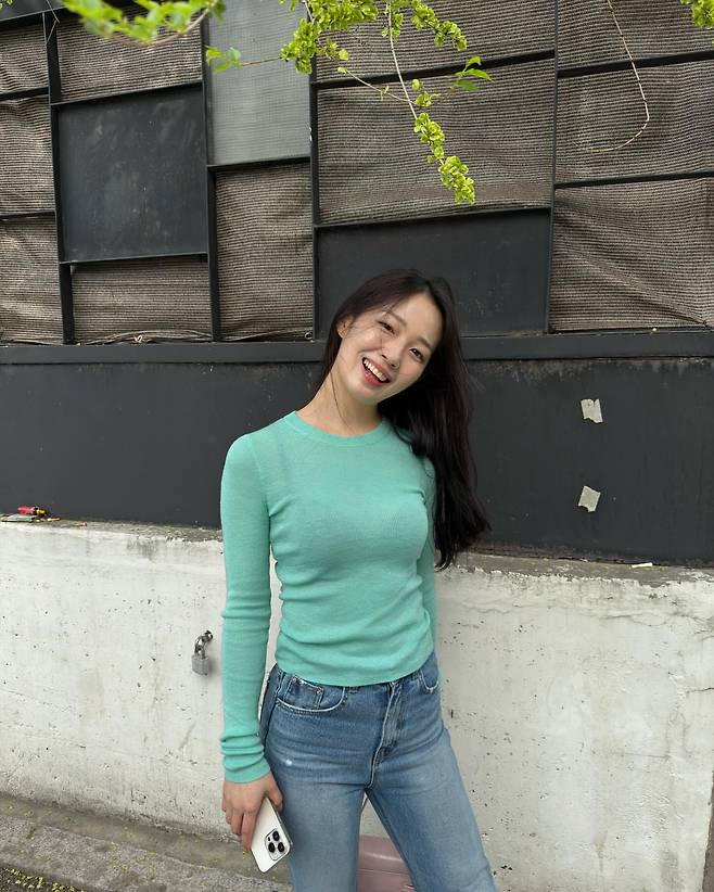 민트 그린 컬러의 피팅 니트를 하이웨스트 데님과 코디해 상큼하고 발랄한 스타일링을 선보이고 있다. 니트의 슬림한 핏이 그녀의 몸매를 자연스럽게 드러내며, 밝은 컬러 톤이 생기 넘치는 이미지를 강조한다. 심플한 아이템 조합으로도 충분히 세련된 룩을 완성하는 센스를 보여준다.