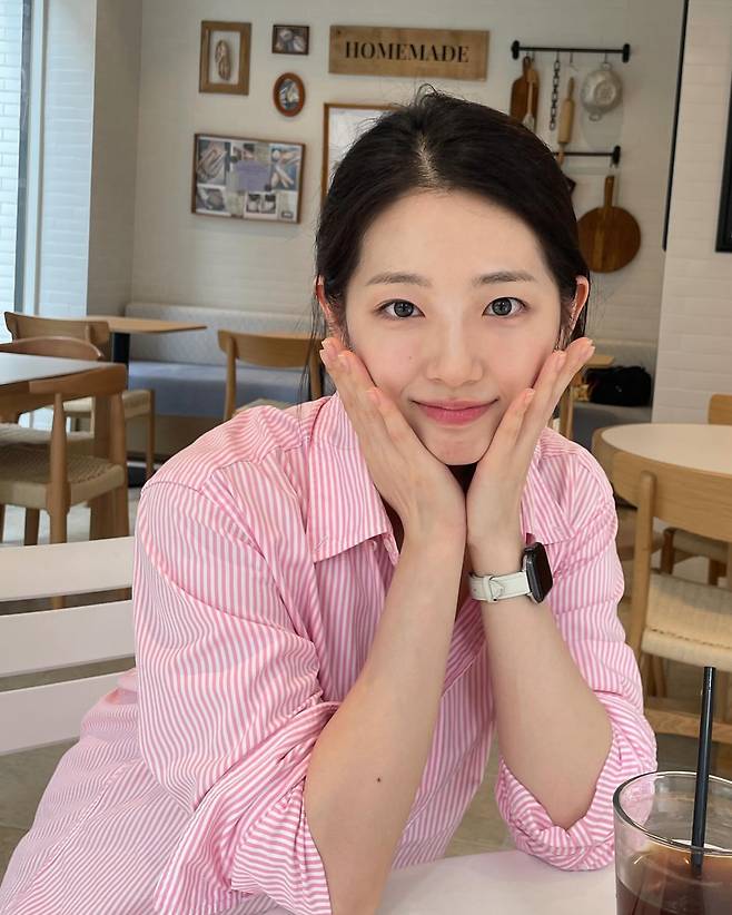 핑크와 화이트 스트라이프 패턴의 셔츠로 깔끔하고 우아한 스타일을 연출하고 있다. 클래식한 셔츠 디자인에 양손으로 볼을 받치는 포즈가 더해져 사랑스러운 매력을 발산한다. 스트라이프 패턴이 주는 단정함과 핑크 컬러의 여성스러움이 절묘하게 어우러진 코디네이션이다.