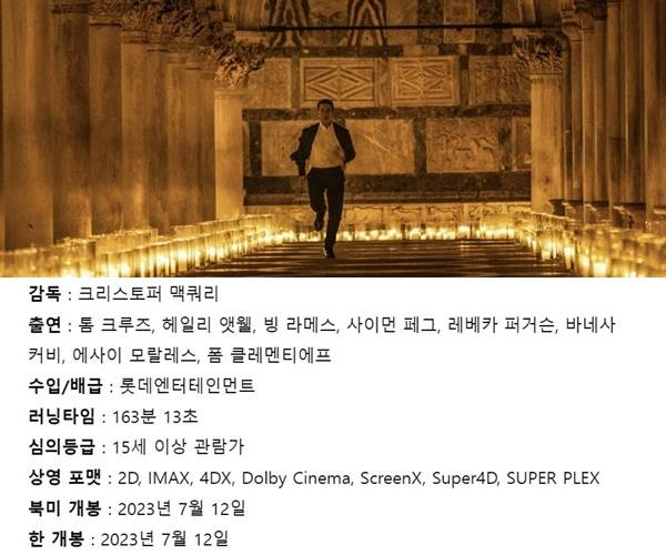 [줄거리] 각국의 첩보망을 교란시키고 무력화시키는 ‘엔티티’라는 지능을 가진(혹은 가졌다고 여기는) AI의 등장.(디지털 기생충에서 슈퍼 AI로 자기 발전함) 이를 무기화하려는 세력들의 손에 들어가기는 것을 막기 위한 에단 헌트(톰 크루즈)와 IMF팀의 극한 미션 성공기. 우선 엔티티를 통제할 수 있는 열쇠와 열쇠의 용도를 찾는 게 급선무. 이를 테면 전반전. 과거의 악연과 마주한 에단 헌트는 시리즈 사상 가장 위험한 작전 앞에서 자신이 가장 아끼는 사람들의 생명과 전 세계 혼란을 막을 임무 중 선택을 해야 하는 기로에 선다.