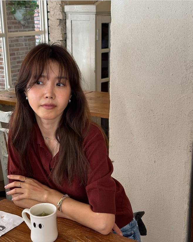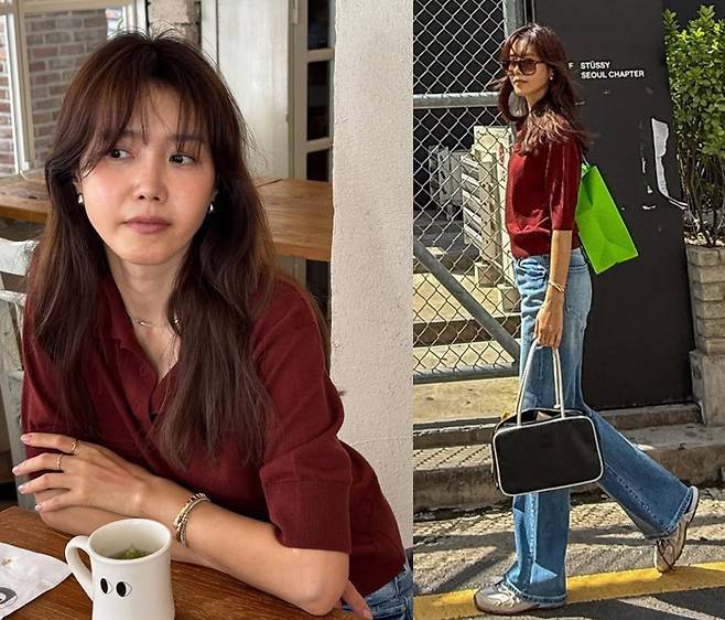 채정안은 레드빛 반팔 니트 톱에 부츠컷 데님 팬츠를 매치해 세련된 데일리룩을 연출했습니다.