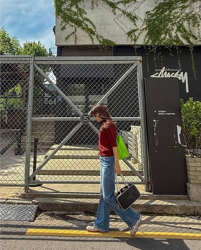 특히 눈길을 끄는 건 그린 쇼핑백과 블랙 스퀘어백을 동시에 든 믹스매치 스타일링으로 컬러감 있는 아이템을 포인트로 더한 센스가 살아있는 룩이었습니다.