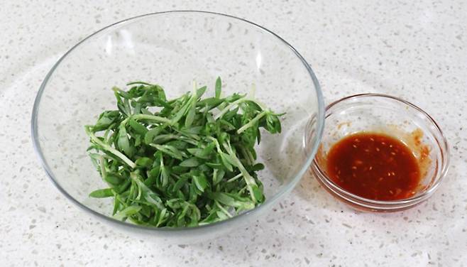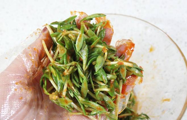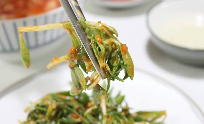 물기를 뺀 돌나물에 초고추장 양념을 넣고 버무립니다. 풋내가 나지 않도록 살살 가볍게 버무려 주세요. 접시에 예쁘게 담아냅니다.