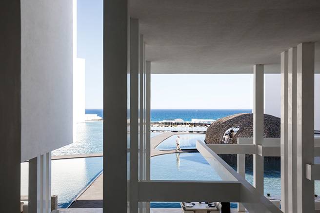 60년 전만 해도 존 스타인벡의 항해 일지에 ‘미지의 어촌마을’로 묘사됐던 로스 카보스는 현재 최고의 풍경마다 최고급 리조트가 자리한 잘나가는 휴양지다. 특히 호텔 신은 2014년 허리케인으로 입은 피해를 재건하며 더욱 치열해졌다. 수십 년 전에 지은 건축물은 최신 트렌드에 맞춰 얼굴을 고쳤고, 창의적인 디자인과 아이디어로 무장한 새로운 호텔이 등장했다. 특히 서쪽 바닷가와 해안 절벽은 프라이버시에 집착하는 셀럽들의 별장과 고급 리조트들의 차지가 된 지 오래다. 기네스 팰트로와 크리스 마틴의 허니문 휴양지였던 에스페란사, 제니퍼 애니스턴이 단골이라는 원 앤 온리 팔미야, 셀 수 없는 셀러브리티들이 거쳐간 라 벤타나 알 파라이소 등이 항상 파파라치와 전쟁을 벌이고 있다. 하지만 셀러브리티의 이름 없이도 최근 인스타그램을 달구고 있는 곳은 마르 아덴트로(Mar Adentro) 리조트다. 첫인상은 미리 본 사진 속 풍경처럼 궁극의 미니멀리즘이다. 멕시코 건축가 미겔 앙헬 아라고네스가 설계했는데, 하얀 건물과 선으로 푸른 하늘과 바다를 구획했고, 리조트 정원은 얕은 물로 채워 물 위에 건물이 떠 있는 것처럼 보인다. 바닥에서 벽과 소파, 그 위의 쿠션까지 모두 화이트 일색이다. “레드 와인을 마시는 것이 금지돼 있어요”라는 직원의 말은 결코 농담이 아니었다. 극도로 절제된 건축물이 짙푸른 바다와 어우러진 풍경만큼은 수고를 마다하지 않고 찾아갈 만한 가치가 있다.