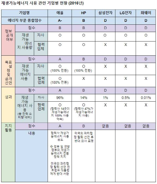 재생에너지 사용에서 큰 의지를 보이지 않는 국내 업체와 달리 애플과 HP는 높은 평가를 받았다. 애플은 2012년 자사의 전력 사용을 100% 재생가능에너지로 충당하겠다고 발표했다. 이후 재생가능에너지 투자를 강화했고 현재 자사의 데이터센터를 비롯해 전 사업장에서 재생가능에너지 사용률을 96%까지 끌어올렸다. 애플은 지난해 협력사의 경우도 100% 재생가능에너지를 사용하도록 하겠다고 밝혔다. 현재 목표 이행을 위해 전 세계 협력사 14곳이 재생가능에너지 100% 사용을 약속했다.